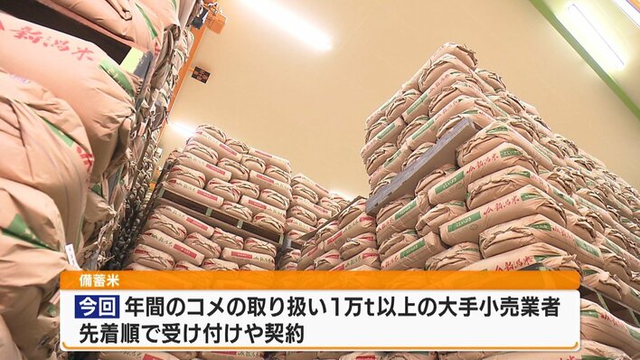 年間のコメの取り扱いが1万t 以上の大手小売業者のみが対象で、備蓄米の随意契約を行い、全国のスーパーで販売されているコメの平均価格4285円の半額、5kgあたり2000円ほどで店頭に並ぶことを目指すといいます。
