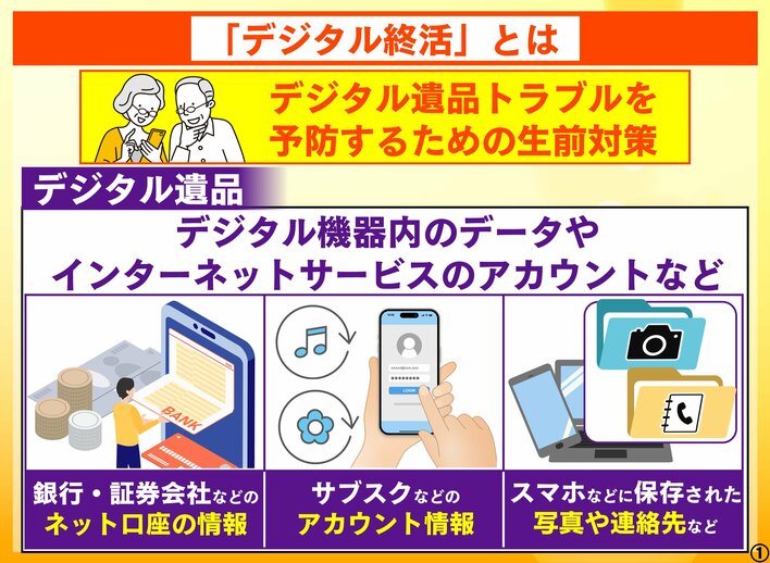「デジタル終活」とは、死後に残されるデジタル機器や、ネット上に残る個人情報などの「デジタル遺品」を生前に整理すること。