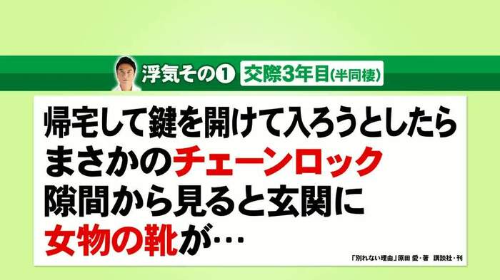 まずは相手の女性に帰ってもらってから、龍二に平手打ちを食らわせたという愛。スタジオの女性陣は、その時点で「絶対別れる」「疑いながらずっと一緒にいるのはつらい」と主張したが、愛は「別れようという話にはなったけれど、まだ好きな気持ちがあった」とその後も交際を続けた理由を語った。