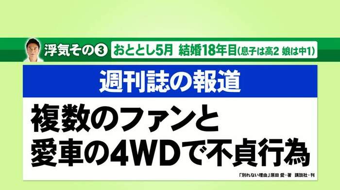 そして交際期間を含めると30年間も連れ添った妻に向かって、「(自分が)死んだ時に『死んでラッキー』と思われるんじゃなくて、『この人の妻でよかった』と思ってもらえる生き方をしなければいけない」「(不倫をネタにメディアに出ている)今は、妻に迷惑をかけている時間。早く2人でテレビに出ないで済む日が来たらいいと思っている」と語った。