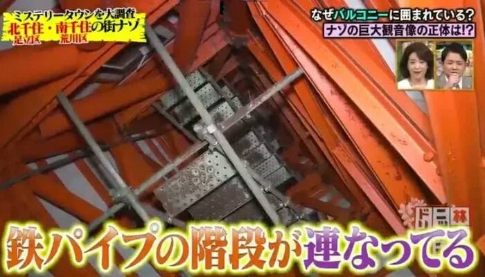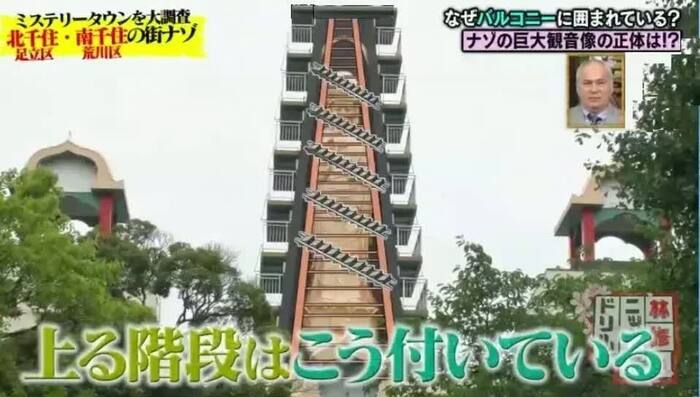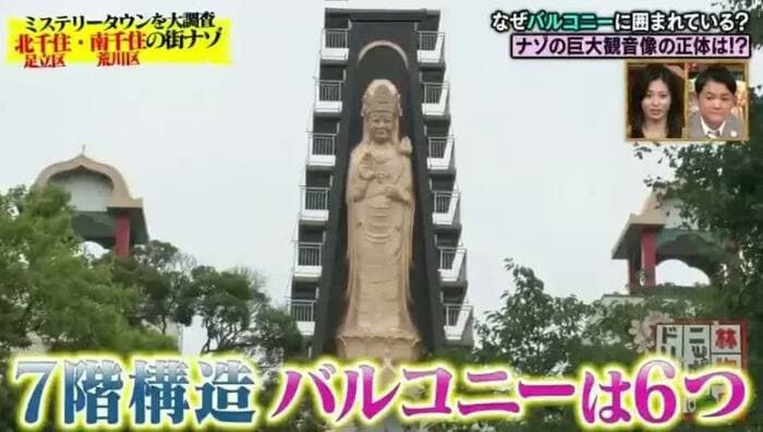 近づいてみると、10m以上はあろうかという観音像が千住の街を見下ろしているのだが、その左右には7階構造のバルコニーが6つずつある。