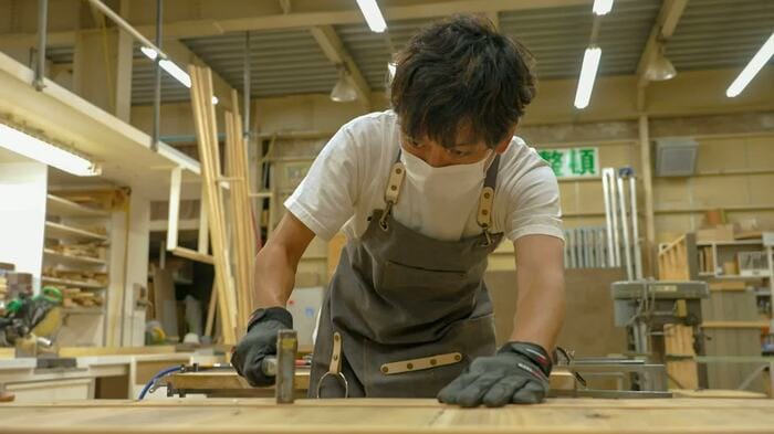 実は、「こどもうどん弁当」のCM内で使われている木の机は、国分発案でTOKIOが手作りしたもの。CM撮影の1週間前、とある工房を訪れた国分は、「何を思ったのか、『机作ってみるか』なんて話を言ってみたら、『いいですね』ってなっちゃった(笑)」と冗談めかしながら明かす。そして「(会社の理念に沿って)汗かいて、手を働かそうと思います!」と、気合いを入れ、天板づくりを開始。