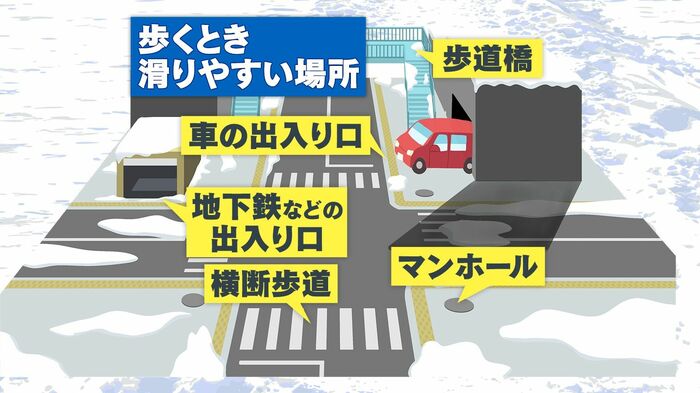 まだ雪残っていますので、特に滑りやすいマンホール、横断歩道の白い部分、車の出入り口付近。