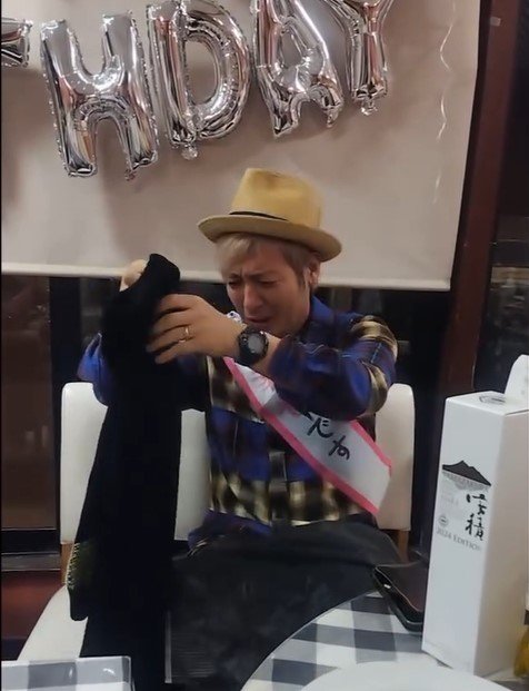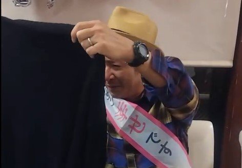 そこには、青とグレーのネルシャツにハットを被り、「世界一幸せです」というタスキをかけたつるのさんの姿が。どうやら、奥さんの美紀さんからプレゼントをもらった直後のようで、その手には黒いセーターが。