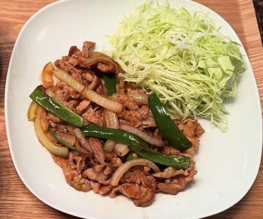 しょうが焼きをよく見てみると、お肉だけでなく、タマネギとピーマンが入っています。切り方も、厚さと太さが均一になっていて美しすぎる出来栄えに!