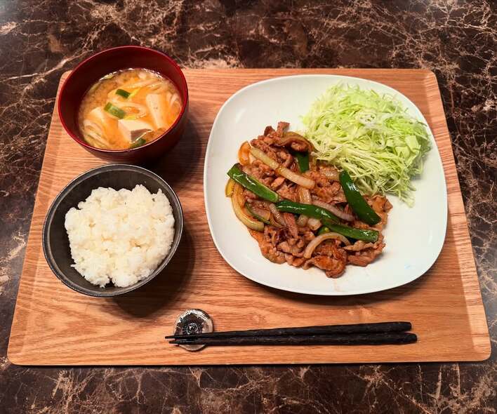 お盆には、キレイに盛り付けされたしょうが焼きに加え、ご飯とお味噌汁が。おいしそうで、見た目の美しい定食です!