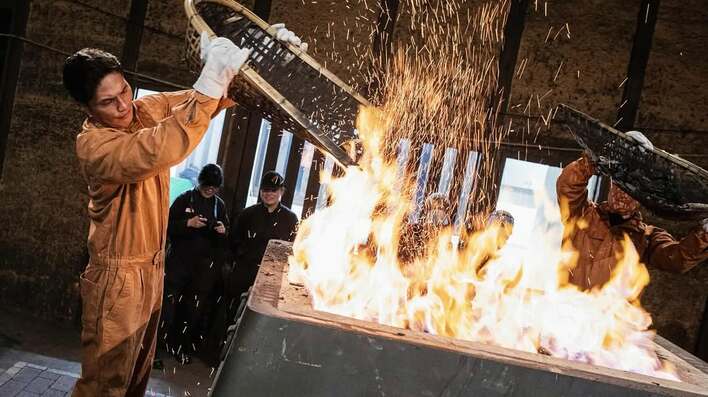 灼熱の中、職人たちが寝る間も惜しみ丹念に向き合わなければならないという“たたら製鉄”。
