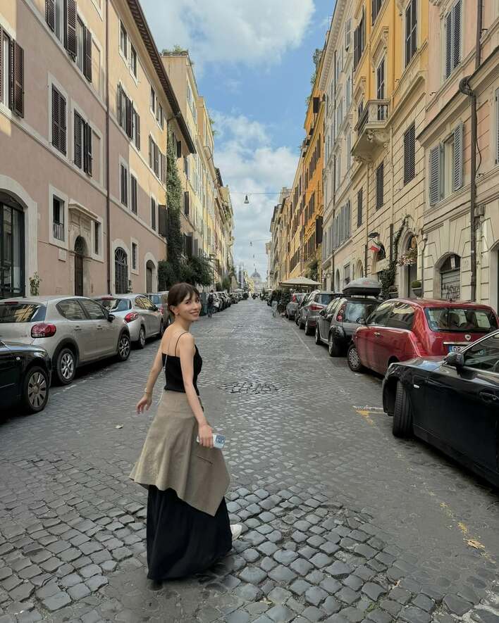 イタリアの首都・ローマを訪れたMay J.さんは、黒いキャミワンピース姿で腰にグレーのジャケットを巻き、車が左右に縦列駐車された石畳の道でにっこりほほ笑みながらこちらを振り返っています。
