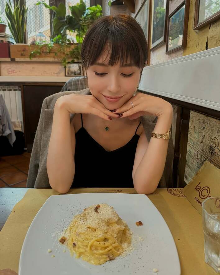 「ローマで有名なカルボナーラを食べに」とコメントし、机に両肘をつき、両手の甲で顎を支えるポーズで、真っ白なお皿に美しく盛られた黄金色のカルボナーラをうっとりと見つめているショットも披露。