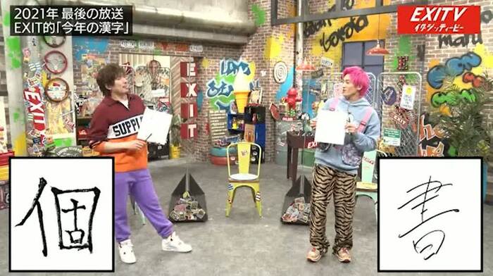 りんたろー。は「個」と発表し、今年は兼近が小説執筆に忙しかったため、「個々の活動が増えた」と理由を挙げる。「個人で楽しむことも増えた」とコロナ禍での過ごし方の変化についても触れると、兼近からは「寂しいですね、見た目に反して」との返しが。りんたろー。も「今年は寂しい年でした」と認めながらも、「(兼近の執筆が)終わってからが楽しかった」と笑顔を見せ、「いつも暗い顔をしてね、絡みづらかった」と執筆中の兼近の様子を振り返る。