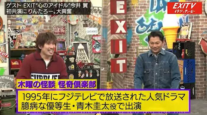 ゲストには今井翼が登場。「EXITの心のアイドル」と紹介された今井は、「アイドルも経験しましたけれども、それがあって今は役者としてやっています」とはにかみながら答え、「でも、うれしいですね」と、はしゃぐ2人に向けて笑顔を見せる。