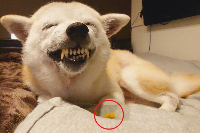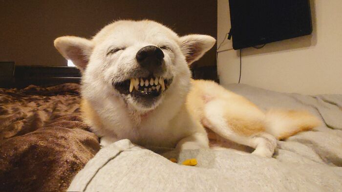 飼い主さんによると、この時、ククリちゃんのお気に入りだという、犬用のかぼちゃクッキーをおやつに食べていたそうで、このように歯を出して笑顔を見せる表情は、大好きなおやつなどを食べるときによくするということです。