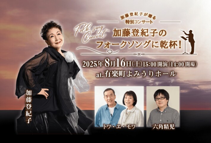 加藤登紀子と紡ぐ、令和の今こそ歌いたい心のフォークソング。フォークソングに魅せられた秘話と戦後80年の夏に贈る、記憶と未来をつなぐ特別な夜!