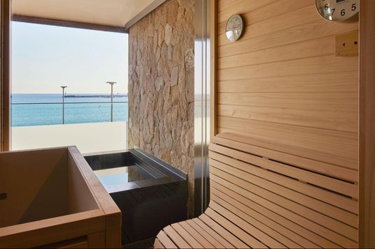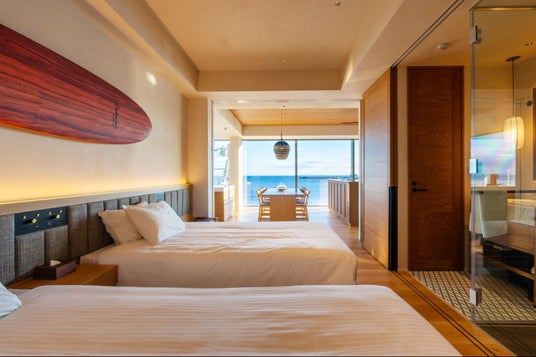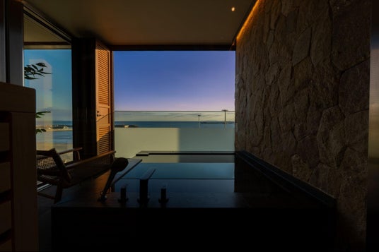 腰越海岸を目の前に臨む立地に位置し、オーシャンビューを遮るものは何一つありません。海側の側面は全てガラス張りになっており、昼間は壮大な海原と青空を、夕刻には夕焼けに染まる江の島を望むことができる絶好のロケーションです。心地よい波音と共に心安らぐ眠りにつき、大海原に反射する太陽の光と共に朝を迎える特別な癒しのひとときが約束された空間です。また、部屋に併設されたバスルームには浴槽だけでなく、サウナ・水風呂も完備。木の温もりと存在感のある石壁が鎌倉の海と調和し、大自然に囲まれたような温浴空間を演出します。