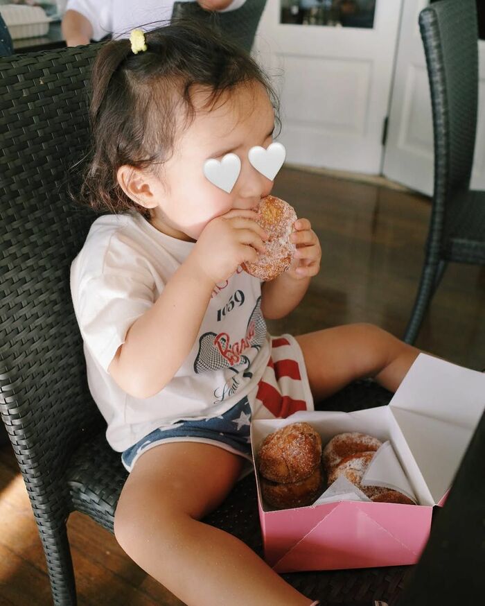 椅子に座り、小さな手でドーナツを頬張る息子さんの姿など、現地の食べ物を堪能したようです!