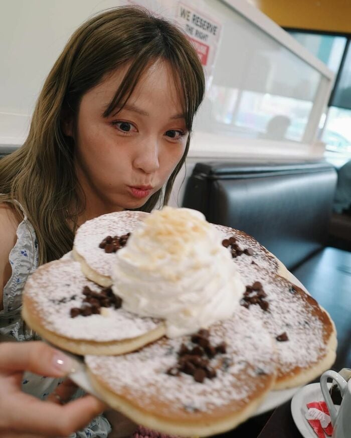 クリームがたっぷり乗ったパンケーキを持ち、驚いたような表情を浮かべるDream Amiさんや…