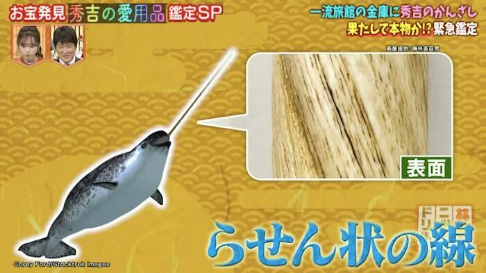 しかし、見ただけでは本当にイッカクのキバかどうか判断できず、秀吉がイッカクのかんざしを使っていたという史料もないので、その場で真贋を鑑定するのは不可能。そこで番組では、イッカクの骨董品を多く取り扱ってきた、大阪「スミコ美術店」の社長・豊澤羊一朗氏に、かんざしがイッカクのキバでできたものか、鑑定してもらうことに。