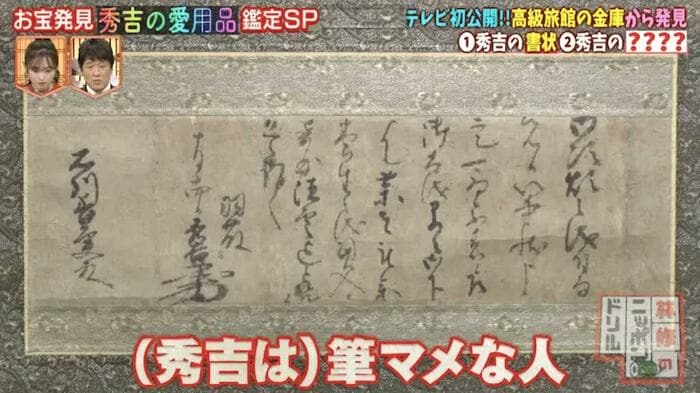 「豊臣」を名乗る前の「羽柴」の「羽」の字が書かれていることから、関白になる前の1582〜85年ごろに書かれたものだと考えられ、鑑定額は300万円。秀吉の書状は、これくらいが相場なのだそうだ。