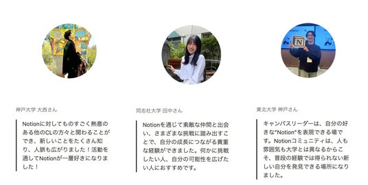 キャンパスリーダーになることで、世界中のキャンパスリーダーとの交流機会を得られるだけでなく、学業以外の活動が多様化する中で、「ガクチカ」(学生時代に力を入れたこと)としての経験や、インターンシップ先での活躍にも繋がると考えています。私たちは、「Notion」を生涯にわたって活用できるツールとして、学生時代から長く使っていただくことを期待しています。