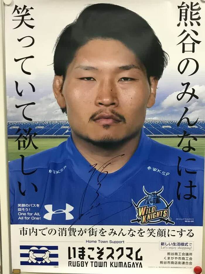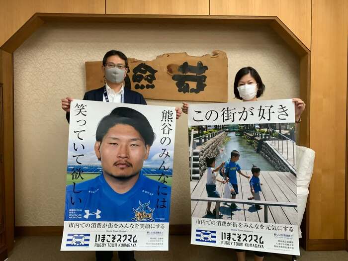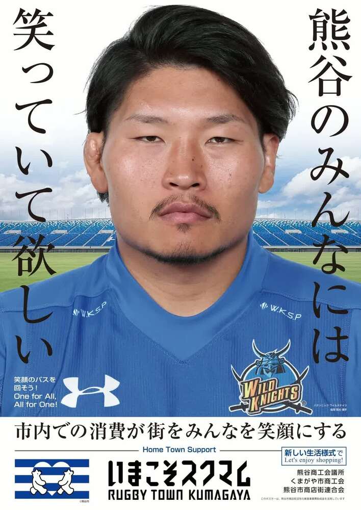 埼玉県熊谷市に本拠地移転を表明しているラグビーの「パナソニック ワイルドナイツ」。そのスター選手である日本代表の稲垣啓太選手を起用したこのポスターは、 新型コロナウイルスによる打撃を受けた市内の事業者を応援し、地元経済の景気回復をはかる目的で、埼玉県熊谷市の商工会議所が中心となって制作した。