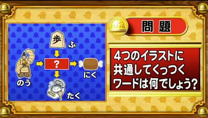 最初は「脳ミングアップクイズ」から、くっつきワードの問題。次の4つのイラストに共通してくっつくワードを答えよ。