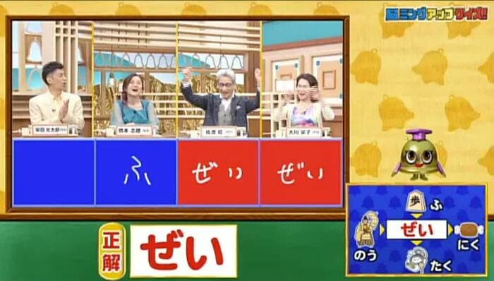 正解は「ぜい(納税・風情・ぜい肉・贅沢)」。佐渡と大川の2人が正解。