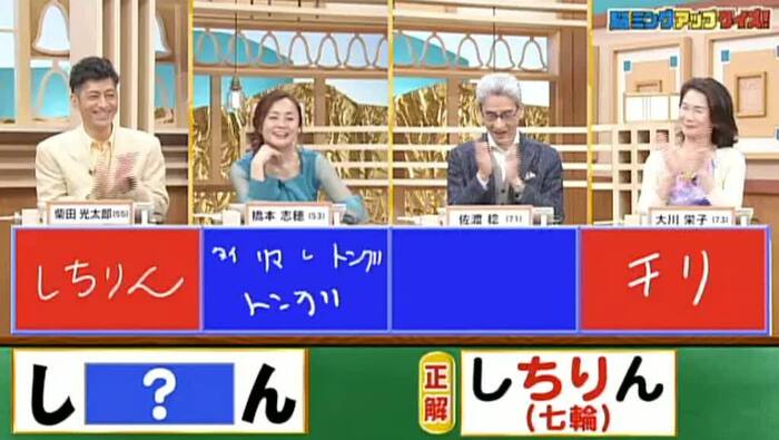 今回の解答者は、俳優で教師の柴田光太郎(55)、タレントの橋本志穂(53)、俳優の佐渡稔(71)、女優の大川栄子(73)の4名。