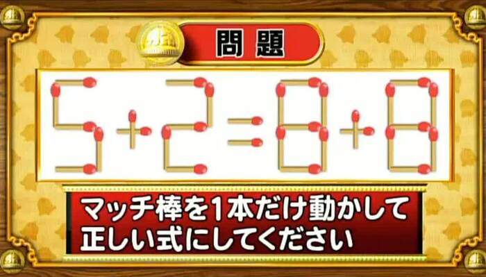 次は、マッチ棒問題。次の式のマッチ棒を1本だけ動かして正しい式にせよ。