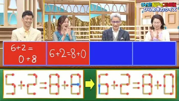 正解はまず、右の式の「8」から1本を動かし「0」にする。その一本を、左の式の「5」に足して「6」にする。そうすれば「6+2=0+8」となる。柴田と橋本が正解。