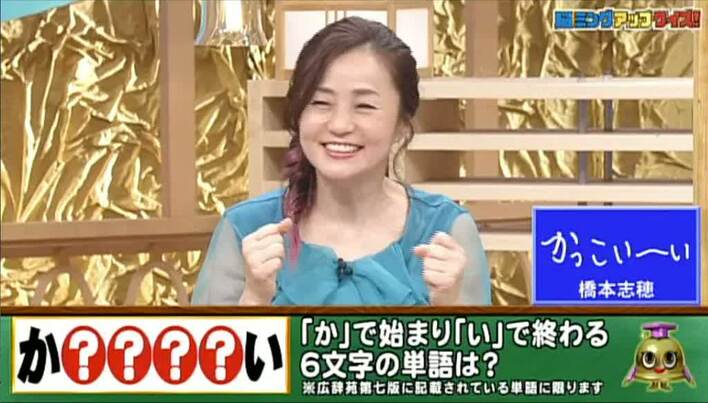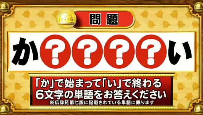 最初は「脳ミングアップクイズ」から、頭とお尻言葉の問題。「か」で始まって「い」で終わる6文字の単語を答えよ。