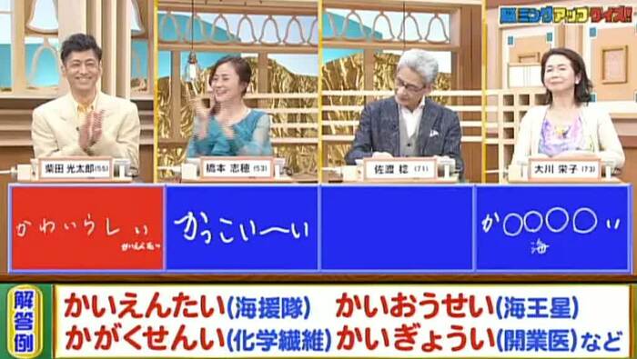 正解は「かいえんたい(海援隊)」「かいおうせい(海王星)」「かがくせんい(化学繊維)」「かいぎょうい(開業医)」など。「かわいらしい」と書いた柴田1人が正解!