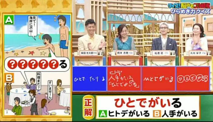 正解は「ひとでがいる(ヒトデがいる/人手がいる)」。橋本、佐渡、大川の3人が正解!