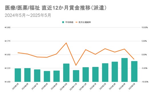 「医療/医薬/福祉」は2024年10月に特定の派遣会社が高時給求人を複数出稿したことで平均時給が大きく上昇しました。その後、これらの高時給求人が掲載終了となった影響で、2024年11月には平均時給が急落。以降は上昇傾向が続いていましたが、2025年4月から5月にかけては1,619円から1,591円へと下落し、6か月ぶりに減少へ転じました。