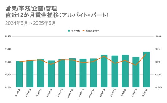 1位の「営業/事務/企画/管理」と13位の「美容/エステ/ネイル」における直近12か月の賃金推移を比較すると、「営業/事務/企画/管理」は平均時給1,200円台を安定して維持し、2025年4月から5月にかけては41円増加して1,280円に到達。1,300円台目前まで上昇しています。複数の派遣企業による時給下限平均1,800円の高時給求人が複数出稿されたことが大きく影響しました。