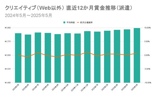 1位の「クリエイティブ(Web以外)」と10位の「医療/医薬/福祉」における直近12か月の賃金推移を比較すると、「クリエイティブ(Web以外)」は平均時給1,800円以上の高水準を維持しながら横ばいで推移しています。
