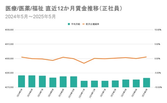 1位の「医療/医薬/福祉」と17位の「映像/イベント/芸能/キャンペーン」の直近12か月の賃金推移を比較すると、「医療/医薬/福祉」は平均月給30万円の水準をほぼ横ばいに推移。