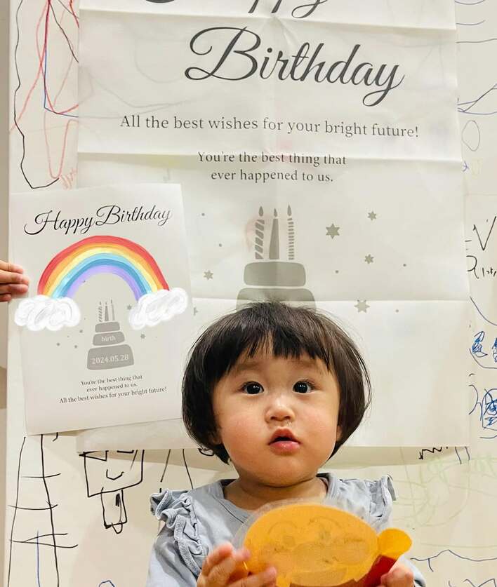 公開された写真を見てみると、「Happy Birthday」と書かれた貼り紙の前には、丸いショートヘアで眉上のぱっつん前髪の次女がつぶらな瞳で見つめる姿が!