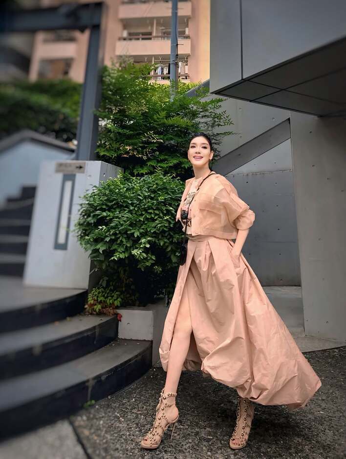 ふわっとしたバルーンスカートに透け感のあるトップスを着用したアン ミカさんが、こちらを見つめ、たたずんでいます。全身ベージュピンクで統一感された上品なコーディネートで、バルーンスカートからのぞくスラリとした美脚にも目を奪われます。