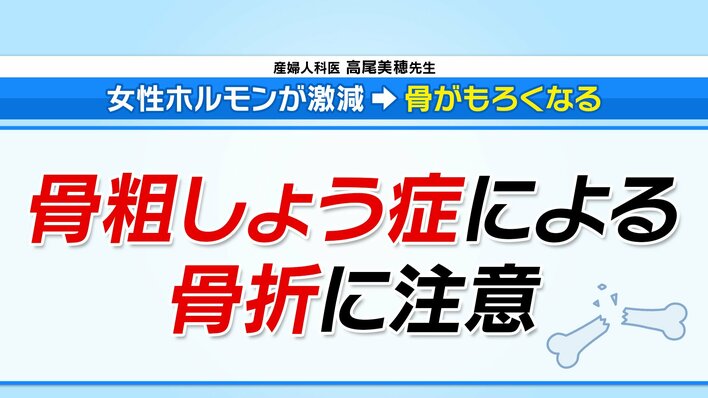 高尾先生が注意を促したのが、閉経の2年後くらいから起こる「アフター更年期」。女性ホルモンの減少によって骨がスカスカになったり、血管や関節のしなやかさが失われ、骨折したり体調を崩したりする人が増えるのだと伝えると、松本さんは「初めて聞いた言葉。更年期が落ち着いても油断してはダメだと思っていないと」と、気を引き締めた様子でした。