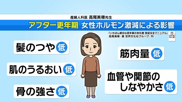 高尾先生は、症状には個人差が大きいとしながらも、「肌質や髪質が変わるほか、コレステロール値を低く維持する、血圧を一定の幅に抑えるといった『生活習慣病』を予防する力が弱くなったり、筋肉量や骨などにも影響が出たりする。ただ、女性ホルモンが減るのは誰もが同じなので、心づもりしていれば不調を予防することもできる」と、しっかりした知識を持つことの重要性を訴えました。
