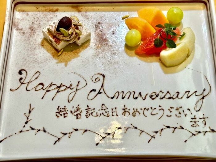 さらに、チョコレートで「結婚記念日おめでとうございます」と書かれたデザートプレートの写真も。