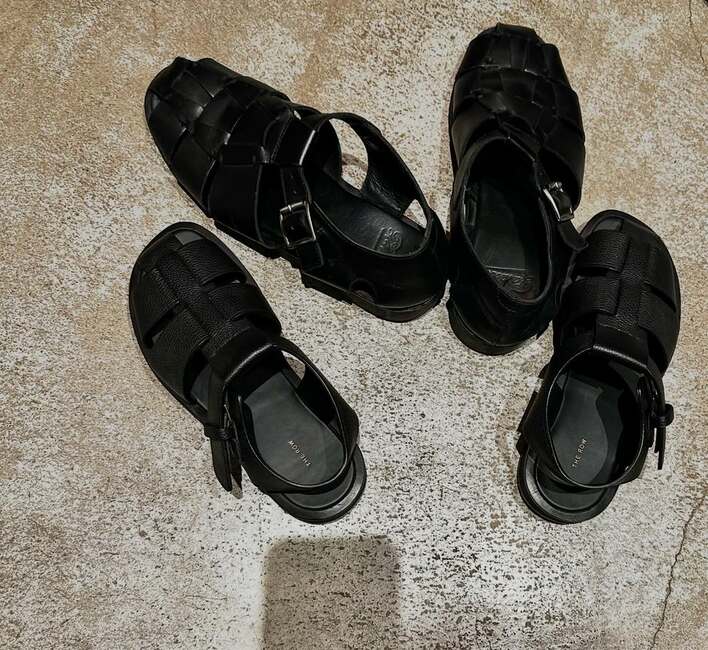 続けて、「怖いです。後ろからピッタリマークされています。」と、黒いレザー調の上品なサンダルを2足公開。