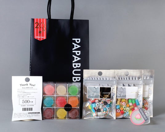 キャンディやバブレッツをはじめ、オリジナルグッズも詰め込んだ、パパブブレの魅力をたっぷり楽しめる内容となっております。さらに、次回のお買い物でご利用いただける“キャンディBAG型”クーポンカードも付属しました。