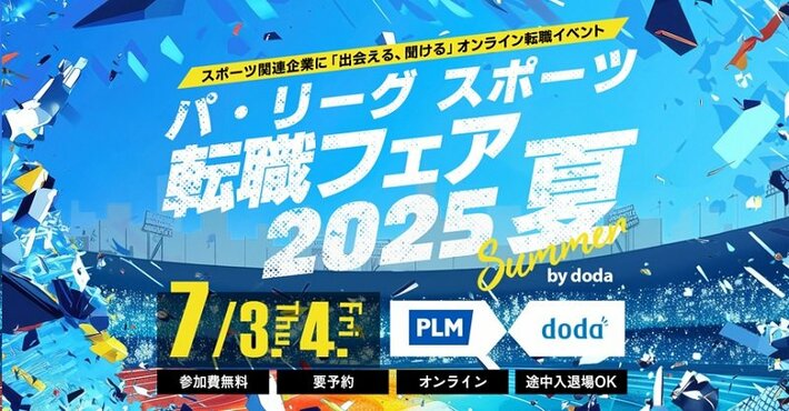「はたらいて、笑おう。」をグループビジョンに掲げるパーソルホールディングス株式会社(本社:東京都港区、代表取締役社長 CEO:和田 孝雄)は、パシフィックリーグマーケティング株式会社(本社:東京都中央区、代表取締役 CEO:新井 仁)が主催し、パーソルキャリア株式会社(本社:東京都港区、代表取締役社長:瀬野尾 裕)の転職サービス「doda」が運営を行う、スポーツビジネスの可能性を知り、キャリアの可能性を広げるイベント「パ・リーグ スポーツ転職フェア2025 夏 by doda」を、7月3日(木)、4日(金)の2日間オンラインにて開催することをお知らせいたします。