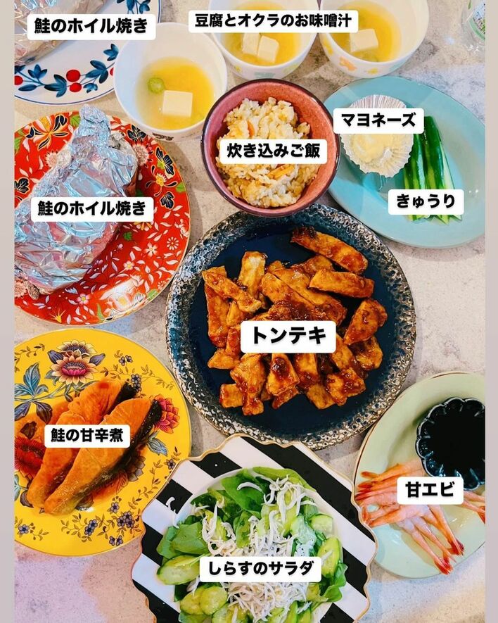 テーブルの上に並ぶのは、「トンテキ」や「鮭のホイル焼き」、「鮭の甘辛煮」、「しらすのサラダ」、「甘エビ」、「豆腐とオクラのお味噌汁」、「きゅうり」「マヨネーズ」、「炊き込みご飯」とバラエティ豊かな8品の料理たち!