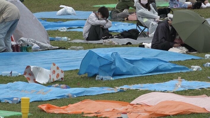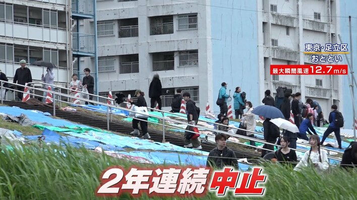 会場では、開始2時間半前からレジャーシートが吹き飛ばされるほどの強い風が吹いていましたが、2年連続の中止に訪れた人は深く肩を落とします。