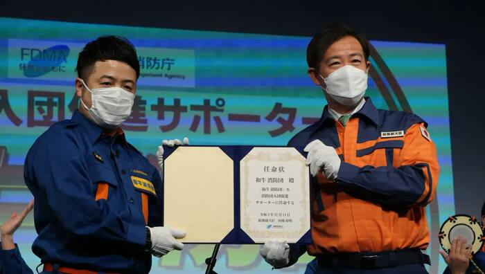 任命状を受け取ると、水田は「国民総消防団を目指して、水田と田畑さん2人で頑張っていきたいと思います。よろしくお願いいたします」とユーモアを交え、意気込んだ。