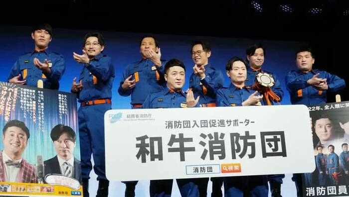 12月14日(火)、消防団入団促進サポーター「和牛消防団任命式」が行われ、和牛(水田信二、川西賢志郎)、すゑひろがりず(南條庄助、三島達矢)、インディアンス(田渕章裕、きむ)、オズワルド(畠中悠、伊藤俊介)が登壇した。