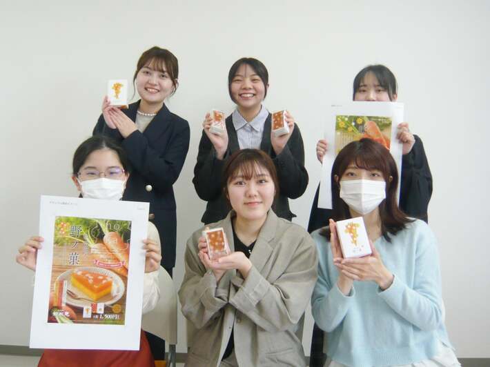お菓子をつくるのに技術(開発)の方にお願いしたり、チラシやパッケージを考える時に企画部の方にご協力いただいたりと沢山の方と連絡を取り「野ノ菓」というお菓子ができました。自分たちのイメージ通りにしていただくための伝え方も学ぶことができました。