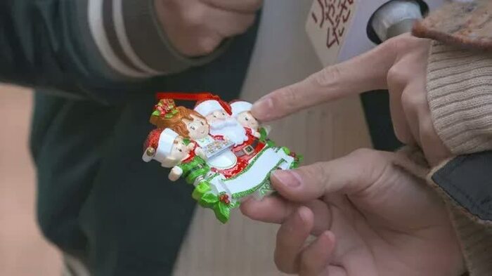そして、オーナメントや置物などクリスマスをモチーフにしたデザインの雑貨もクリスマスマーケットのもう1つの魅力だ。購入したオーナメントに名前などの文字を入れてくれるということで、真剣に選び始めた3人。川西は「僕かわいいの見つけました!赤ちゃんみたいでかわいいデザイン」と手にとり、指を指して「これ豆に似ている」と描かれた子供の絵で笑いを誘った。
